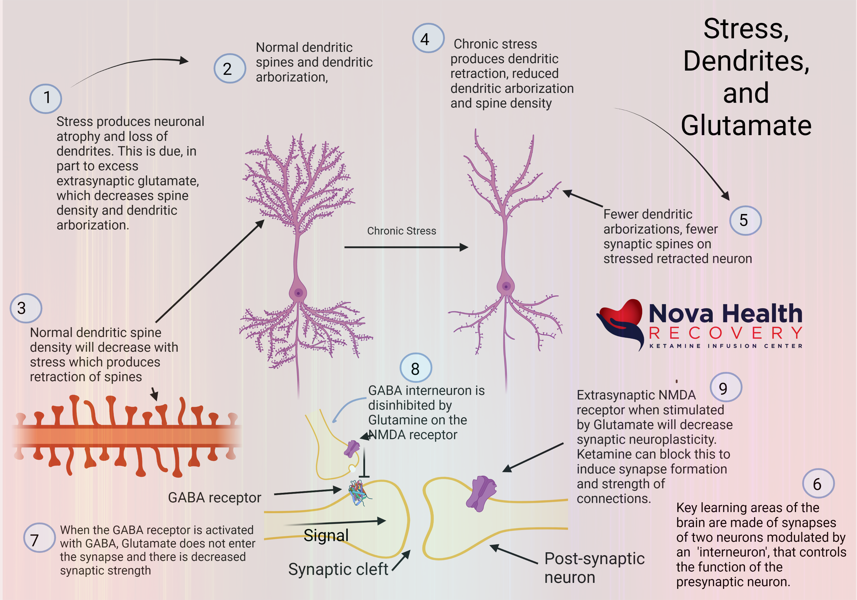 Stress with elevated cortisol levels results in damage to nerve endings as axons thin and dendrites disappear. Constant glutamate transmission from a brain on fire results in damage and loss of neurons. This is seen on MRI’s as measurable loss of brain volume. This is seen clinically as depression and anxiety. Depression is being recognized as more of a glutamate receptor issue. Ketamine can reverse this by replacing damaged neuronal spines and rapidly increasing connectivity in the brain.