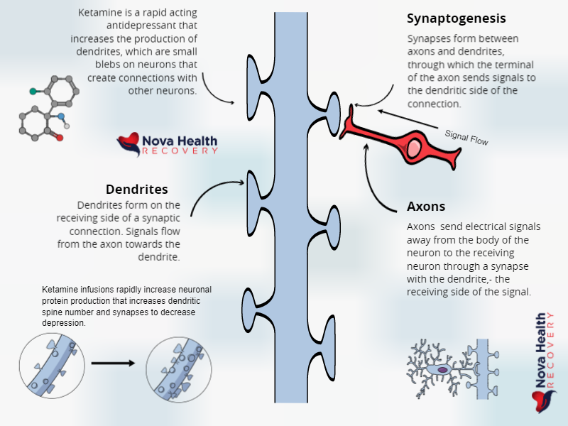 In summary, ketamine shifts activation by glutamate from the NMDA receptors to the AMPA receptors resulting in the production of BDNF, which promotes growth and survival of neurons and thereby produces neuroplasticity. In these same neurons, mTor (mammalian target of rapamycin) is activated, which synthesizes proteins involved in memory formation, particularly in the prefrontal cortex (the CEO of the brain) and the hippocampus (involved in memory). Thus, BDNF reverses the damage produced by chronic stress. This is what produces the new dendritic spines of learning and connection in the brain to reverse depression. This occurs within hours of an infusion.